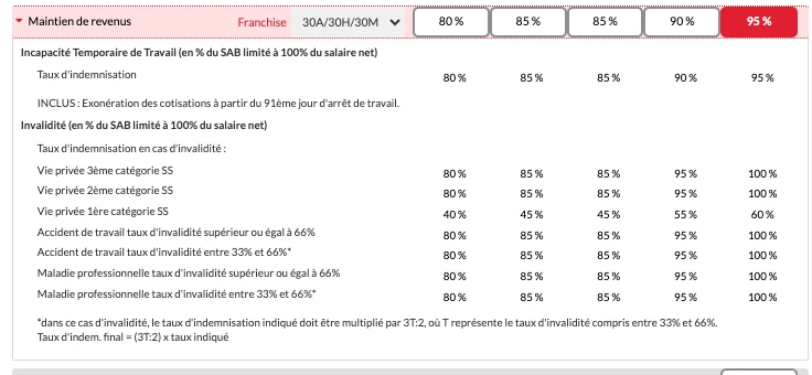 Ci-dessous un exemple des garanties d'une prévoyance d'entreprise de la convention collective Syntec. Le niveau de protection dépend de ce qui a été choisi par votre entreprise (les niveaux sont en rouge en haut de la copie d'écran). La convention collective de votre entreprise peut imposer des garanties minimums.